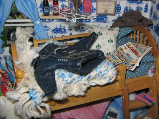 Za lalką resinową widać "bean-bag" uszyty przeze mnie z weluru, przy czym popełniłam tu jeden kosmiczny bład. Wypełniłam fotel kaszą grzyczaną, ale nie wyprażyłam jej wczesniej w piekarniku i robaczki mi sie nieustannie lęgły w roomboxie. Torba z GAPa nabyta w sklepie miniaturystycznym Tiny Dollhouses w NY.