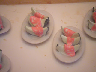 A poza tym swap pt. Bed & Breakfast jest praktycznie gotowy, chociaż zastanawiam się jeszcze nad ewentualnym dodatkowym elementem. Na razie mój swap składa sie z pólmiska z kawałkami melona z szynką i deski z plasterkami szynki z czymś tam (różnie, ser, kiełbasa, salceson, owoce, pieczarka), natomiast dla wspóółpracowników mam na razie tylko deski, ale może jeszcze coś wymyslę. Np. terminarz z modeliny, taki jak robiłam ostatnio...